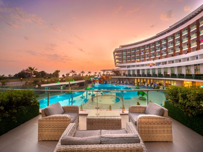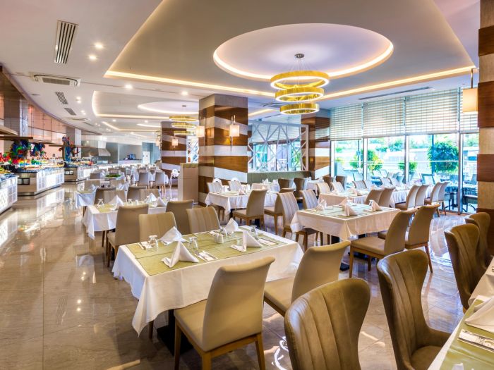 Основен ресторант, 1 а-ла-карт ресторант (рибен/турски – 1 безплатно посещение при минимум 7 нощувки), снек ресторант, сладкарница, 5 бара, 2 открити и 1 закрит басейн, аквапарк, амфитеатър, СПА център, 2 конферентни зали.