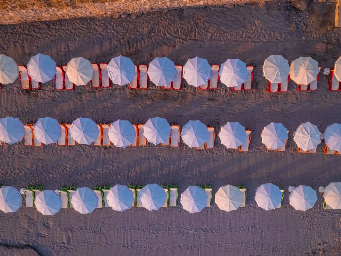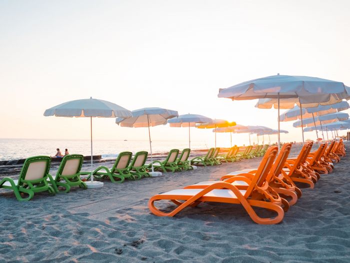 Собствен, каменист плаж, на 50 м. от хотела. Чадъри, шезлонги и матраци на плажа и при басейна - безплатно.