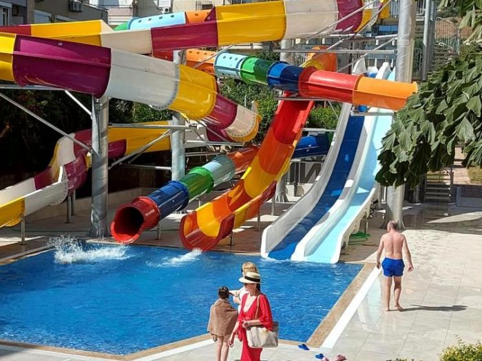 Основен ресторант, лоби бар, снек бар при басейна, 2 открити басейна, 4 водни пързалки, ТВ стая, 1 конферентна зала.