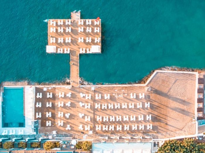 Собствен, платформа и пясъчна зона. Чадъри и шезлонги на плажа и при басейна безплатно.