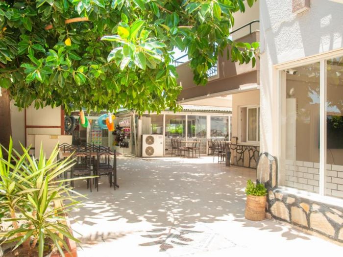 Разполага с плаж, състоящ се от камъчета и пясък, на разстояние 600 м от морето. Безалкохолните напитки са безплатни. Има два басейна за възрастни и