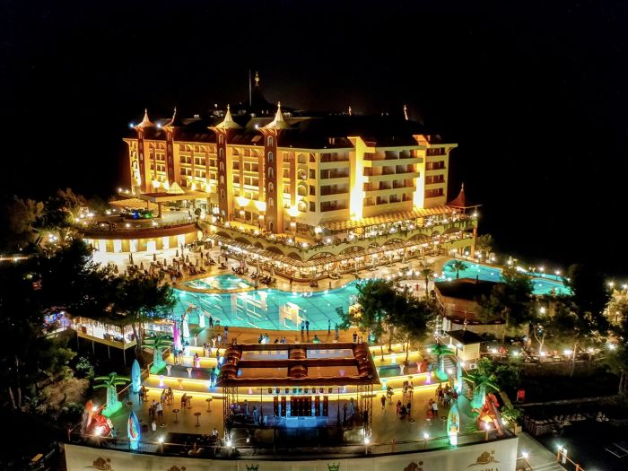 Основен ресторант, 3 а-ла-карт ресторанта (италиански, турски, рибен – срещу допълнително заплащане), 3 снек ресторанта - възможност за приготвяне на специални ястия за гости с алергии, 8 бара, сладкарница, 5 открити басейна, вътрешен отопляем басейн, аквапарк с 8 пързалки, фитнес, СПА център, магазини, 3 конферентни зали с оборудване, Wi-fi интернет – според концепцията на хотела.