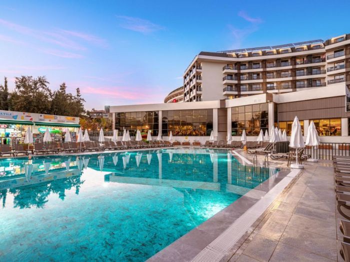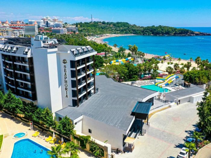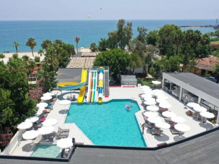 Намира се на 92 км от летище Анталия, на 100 км от центъра на Анталия, на 32 км от центъра на Алания, на 100м от брега на морето, на обща площ от 6 250 м2. Реновиран 2023 г.