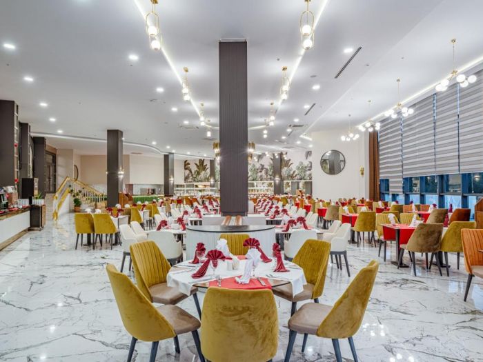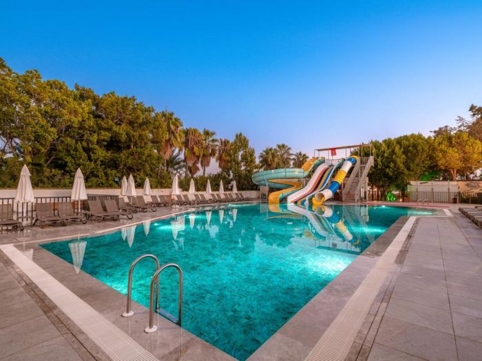 Основен ресторант, а-ла-карт ресторант – интернационален (1 безплатно посещение минимум 7 нощувки), сладкарница, 3 бара, открит и закрит басейн, водни пързалки, СПА център.
