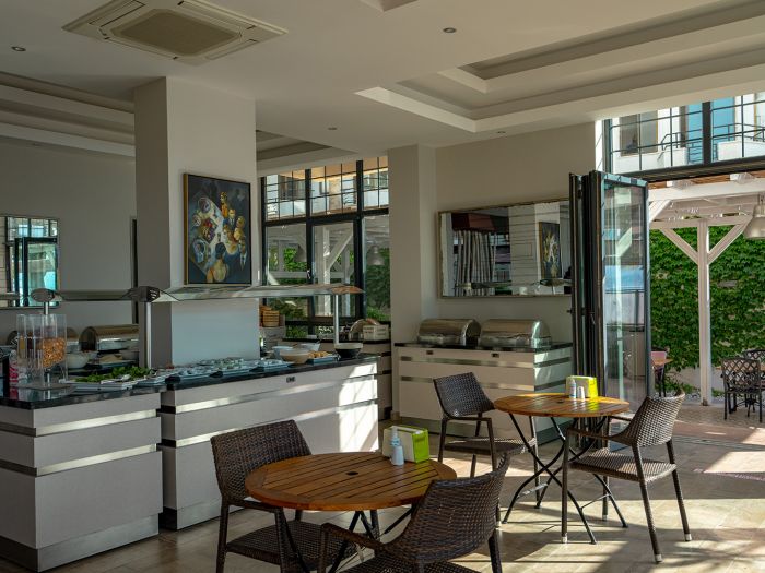 Хотелът разполага с 60 стаи, от които 5 стандартни стаи с изглед суша, 35 стандартни стаи с изглед море, 20 премиум стаи с изглед море. Всички стаи са оборудвани с климатик, телевизор, телефон, баня с душ/вана, сешоар, мини бар (безплатен), сейф (платен), балкон. Почистване на стаите – всеки ден, смяна на спалното бельо и кърпите – 2 пъти в седмицата.