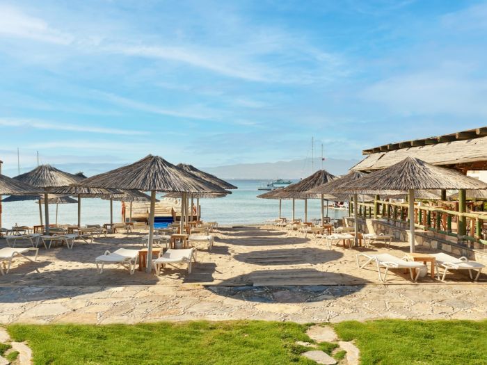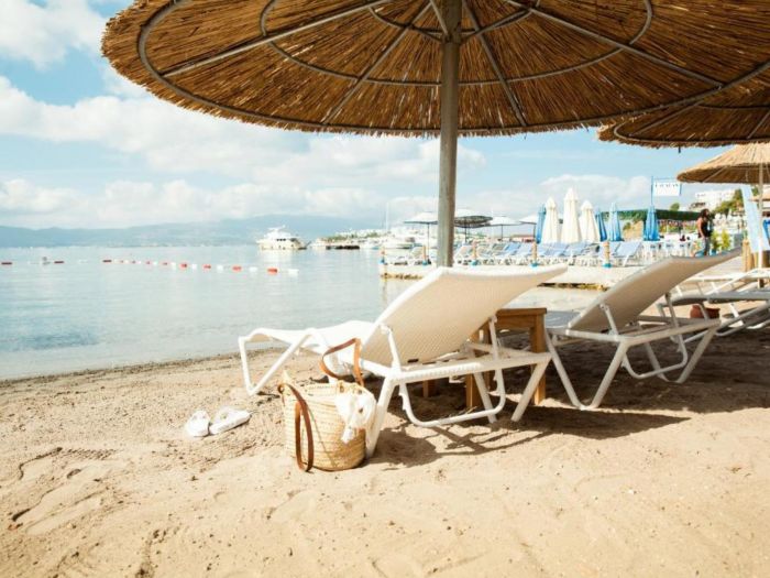 Собствен, пясъчен, платформа. Чадъри, шезлонги и плажни кърпи на плажа и при басейна – безплатно.