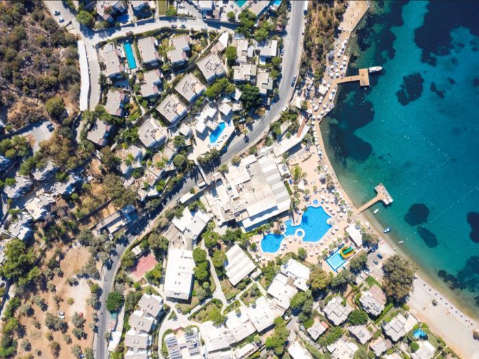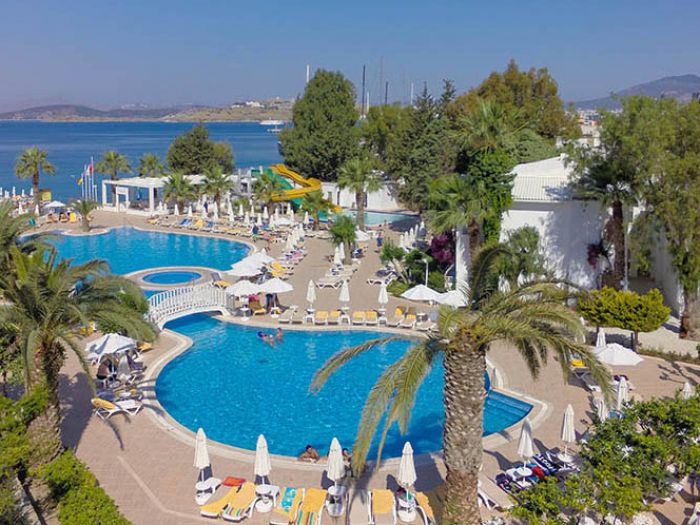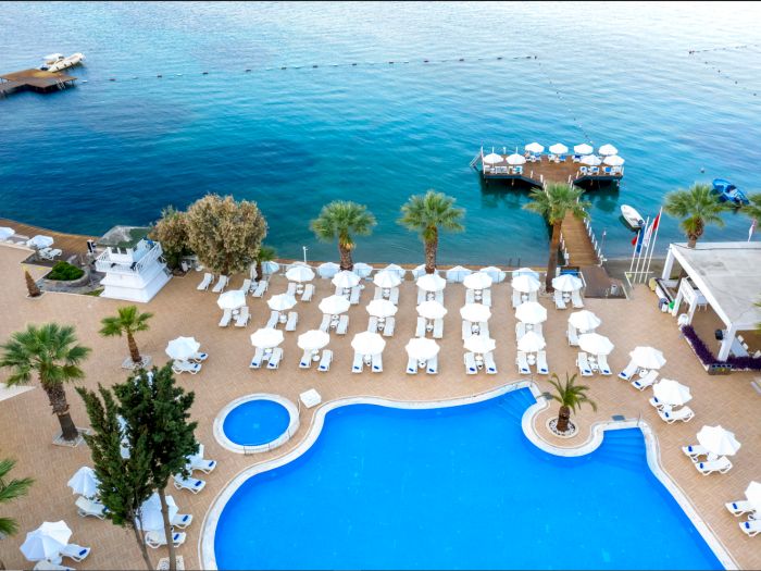 Намира се на 35 км от летище Милас, на 1 км от центъра на Бодрум. Построен върху обща площ от 32 000 м², последна реновация през 2015 г.