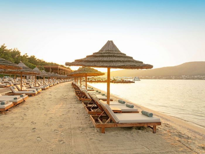 Собствен пясъчен плаж с бял пясък и дължина от 350 метра, притежател на "Син флаг" - чадъри и шезлонги на плажа и при басейна безплатно, плажни кърпи - безплатно.