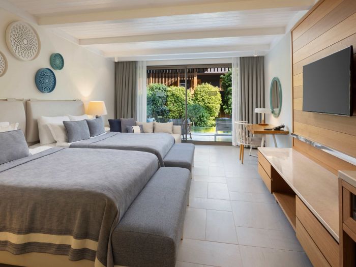 Стаи: Sea view room (спалня, баня, с изглед към море, 39 - 47 м²), Superior room (спалня със зона за сядане, баня – 51 м²), Deluxe room (спалня със зона за сядане, баня – 80-85 м²), Family Room (1 спалня, отделна стая с 2 легла, 2 бани – 54 м²), Standard swim-up room (спалня, баня, с директен достъп до общ басейн, тераса – 39 м²), Superior swim-up room (спалня със зона за сядане, баня, с директен достъп до общ басейн, тераса с два шезлонга – 51 м²), Swim Up Family Room (2 спални, 2 бани, с директен достъп до общ басейн, тераса с два шезлонга – 54 м²), Deluxe Swim Up Room (спалня със зона за сядане, с директен достъп до общ басейн, тераса с два шезлонга, вана и отделна душ кабина – 80-85 м²), Exclusive Swim Up (с директен достъп до общ инфинити басейн, спалня, баня с вана и отделна душ кабина, гардеробна зона, тераса с два шезлонга и джакузи; премиум услуги, закуска в ресторантите Hasır и Pascarella, ексклузивен минибар, безплатен румсървис, безплатни перални услуги – при минимум 7 нощувки, частна плажна кабана, личен иконом (butler service), частно бъги с иконом, кожен ключодържател и плажна чанта – 90 м²), Family Suite (фамилна стая суит, хол, кухненски бокс, спалня, детска спалня с 2 единични легла, 2 отделни бани, тоалетна, кът за сядане, работно бюро и балкон – 90 м²), Family Suite Room Swim Up (фамилна стая суит, директен достъп до басейна, 1 спалня, 1 отделен хол, 2 бани, кухненски бокс – 90 м²).