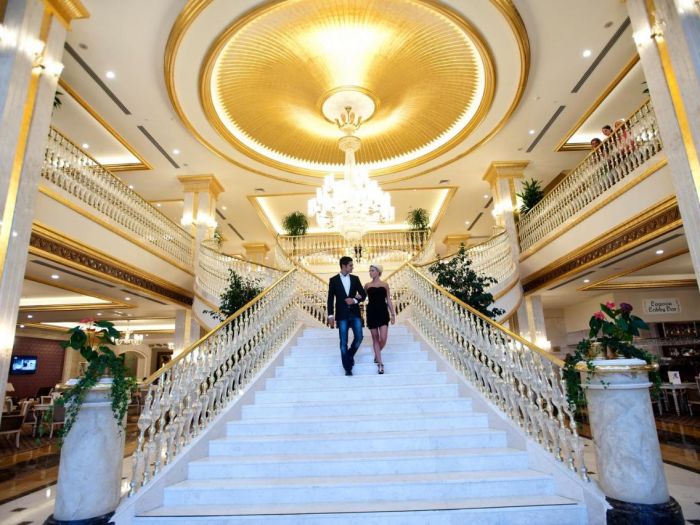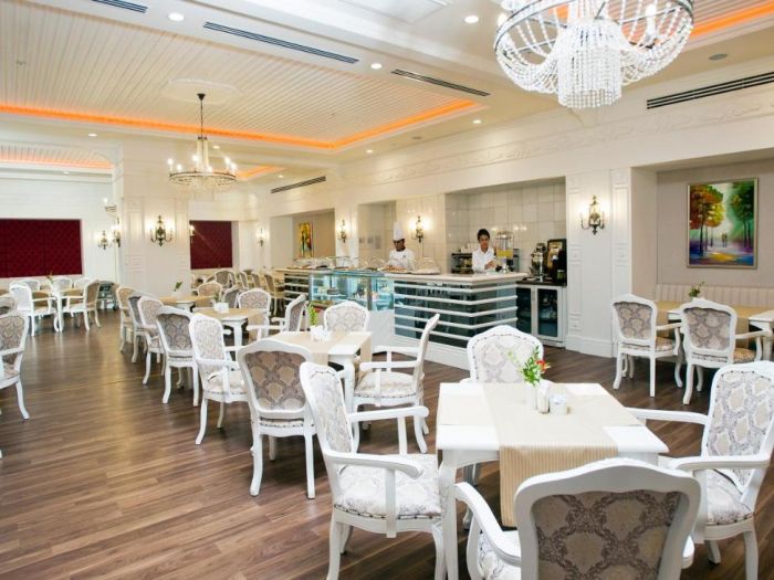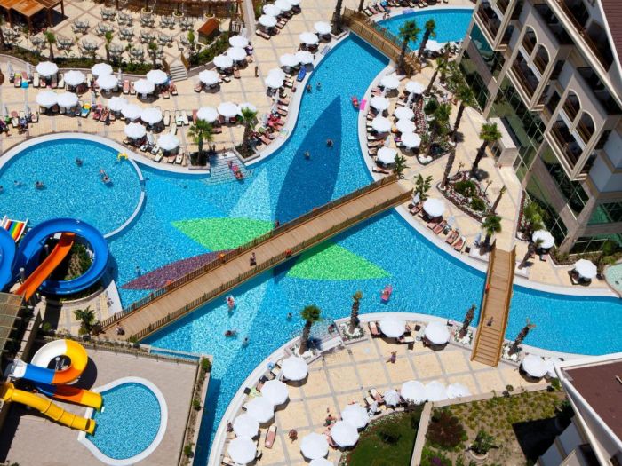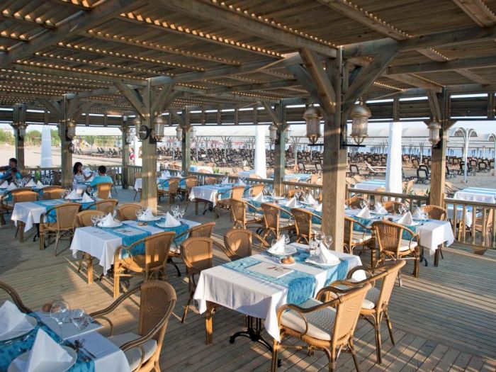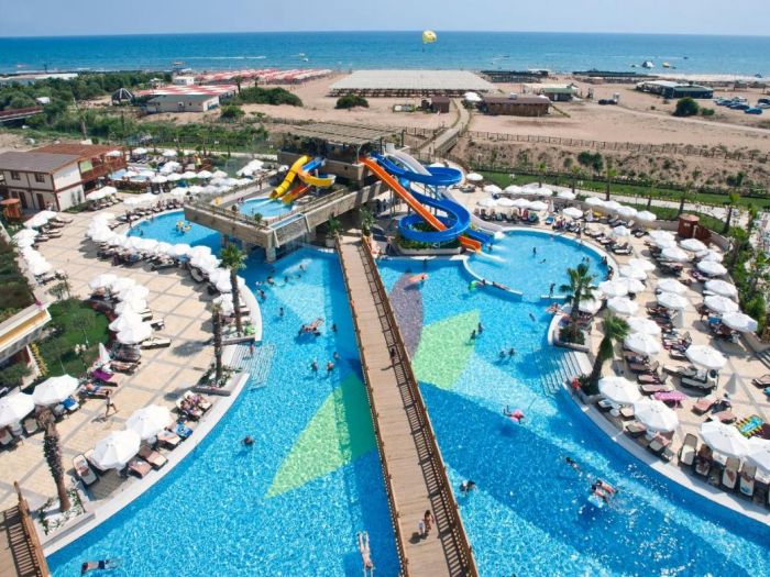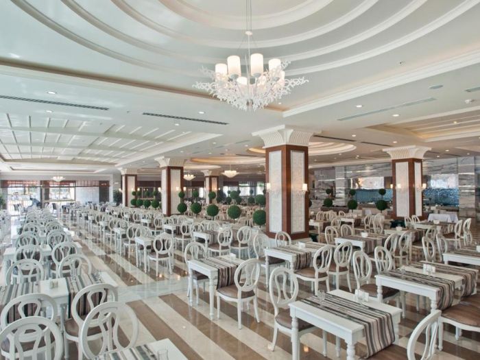 Основен ресторант с диетично и вегетарианско меню, 5 ресторанта a - лa - карт (италиански, турски, рибен, мексикански, китайски), 6 бара, открит басейн, закрит басейн, 3 водни пързалки, кинотеатър, лекарски кабинет, SPA - център, фризьор, магазини,2 конферентни зали. За децата: детско меню, детски басейн, аквапарк, детски мини клуб(4-12г.), младежки клуб(13-16г.) Безплатни услуги: турска баня, сауна, вътрешен басейн, тенис на корт, тенис на маса, дартс, мини голф, баскетбол, фитнес зала, Интернет. Платени услуги: масаж, билярд, боулинг, кан, водни спортове, фризьор, СПА - център.