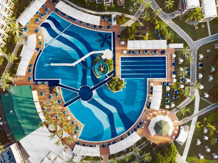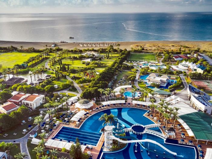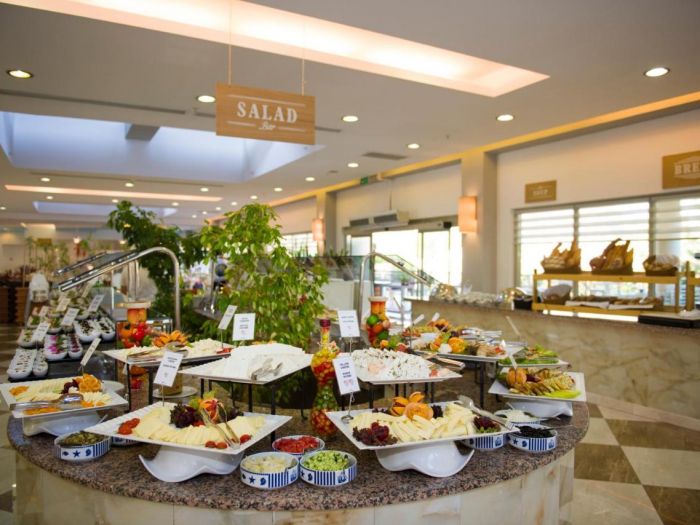 Основен ресторант „The Restaurant“„Pool Open Buffet”, Spice A-la-Carte Restaurant, Италиански ресторант Prima Cucina, Турски ресторант Taverna, Green & Grill Restaurant. Ресторантите Turkish Taverna, Spice и Prime Cucina A la Carte са само с резервация и гостите имат право да посетят всеки ресторант веднъж по време на престоя си. А-ла-карт ресторантите са отворени 6 дни в седмицата. Aegean Bar (Отворен 24 часа в денонощието, заплаща се след 00:00ч.), Pool bar, Chill Out Beach Bar, Disco/Chill Out Bar (23:00-02:00), Thea’s Coffee Shop & Juice Bar, 2 външни басейна (1900m², 480 m²), 1 вътрешен басейн (450 m²отопляем през май и октомври), 3 външни детски басейна и 1 вътрешен басейн (450 m², отопляем през май и октомври), 5 водни пързалки (2 за възрастни и 3 за деца), тенис корт, голф игрищe, СПА център, 3 конферентни зали, магазини, паркинг.