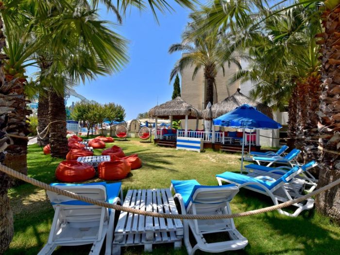 Собствен, широк пясъчен плаж, с дължина 400 м - удостоен със син флаг; с лек наклон; при влизане в морето има камъчeта. Безплатни плажни кърпи (с хавлиени карти в посочените часове). Шатрите на плажа - безплатни; шатрите край басейна се резервират и заплащат на рецепция предварително.