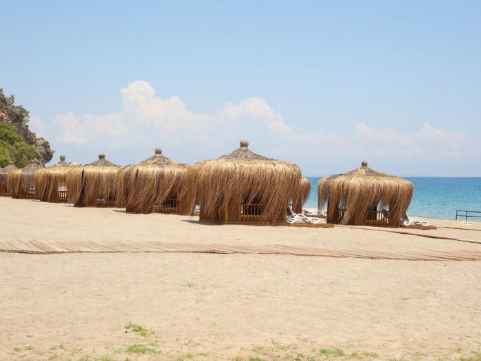 Собствен, пясъчно – чакълест, с дължина на плажната ивица 630 м. Чадъри, шезлонги и плажни кърпи на плажа и при басейна – безплатно.