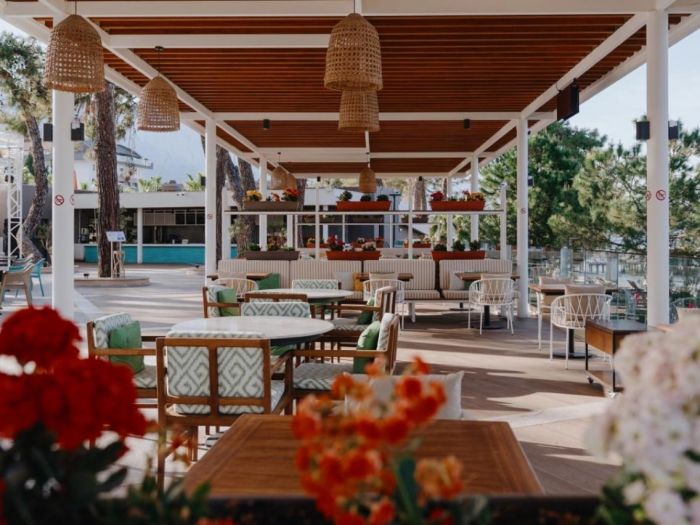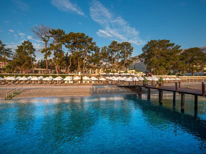 Намира се 55 км. от летище Анталия, на 45 км. от центъра на Анталия и на 600 м. от центъра на Кемер на брега на морето. Построен през 2003г. с обща площ 30 000 м2. последно реновиран през 2023г.