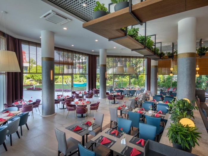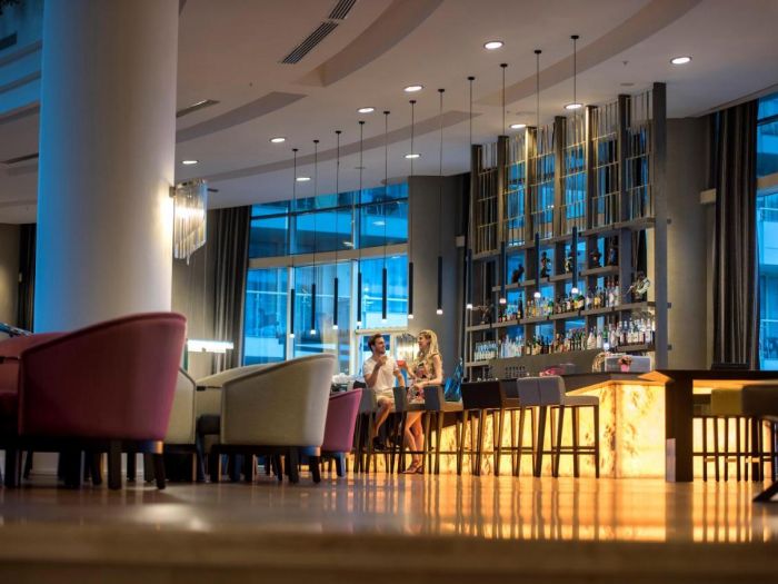 Безплатни услуги – мини бар, сейф, хамам, сауна, парна баня, фитнес, кино, водна гимнастика, мини – голф, тенис корт, аеробика, тенис на маса, пилатес, йога, паркинг