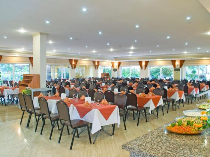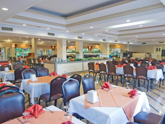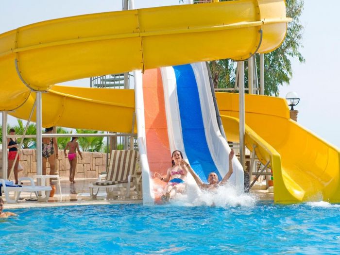Основен ресторант, ресторант a-la-carte (рибен, с предварителна резервация, платено), 6 бара, открит басейн, 2 водни пързалки, лекар, фризьорски салон,