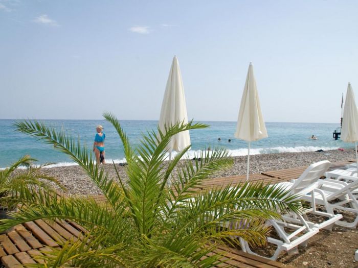 Собствен, чакъл. чадъри, шезлонги и матраци - безплатно. Плажни кърпи - платено.