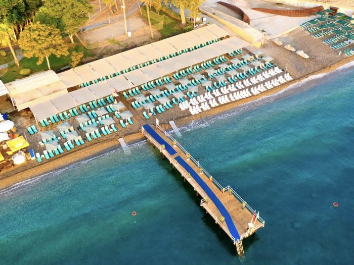 Собствен, чакълест плаж. Чадъри, шезлонги и матраци на плажа и при басейна – безплатно, плажни кърпи – срещу депозит.