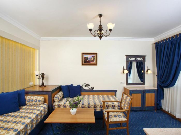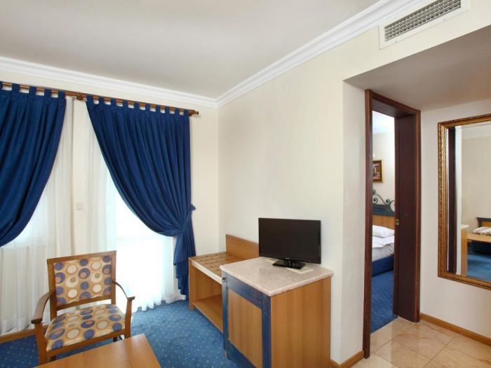 Всички стаи са оборудвани с климатик, телевизор, телефон, баня с душ/вана, сешоар, минибар (безплатно, еднократно зареден при пристигане, ежедневно зареждане с вода), сейф (безплатен), балкон. Почистване на стаите и смяна на кърпите - всеки ден, смяна на спалното бельо - 3 пъти в седмицата.