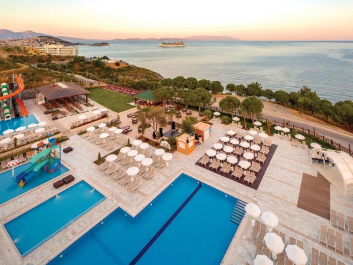 Намира се на 70 км от летище Измир, на 140 км от летище Милас, на 2 км от центъра на Кушадасъ. Построен през 2015 г. на обща площ от 30 000 м².