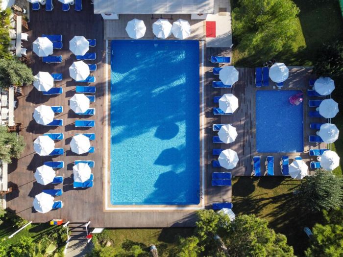 Плаж: собствен, пясъчно-чакълест със сертификат „Син флаг“. Чадъри и шезлонги при басейна и на плажа - безплатно.