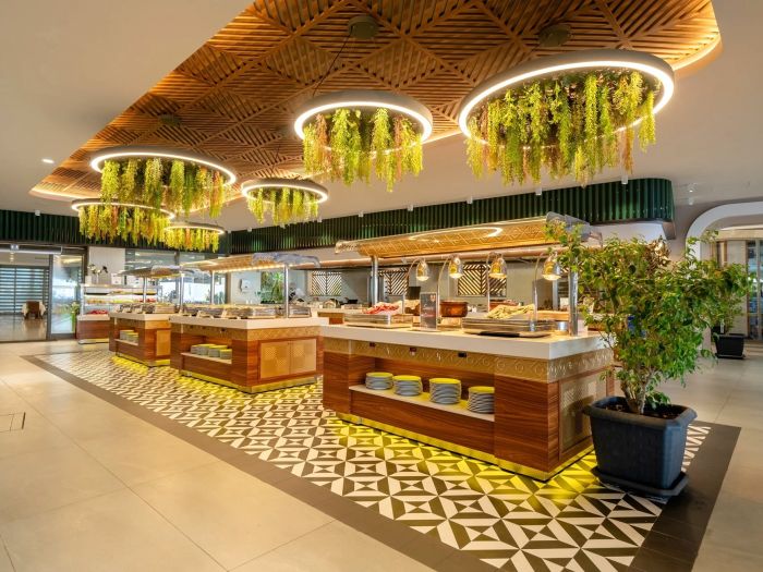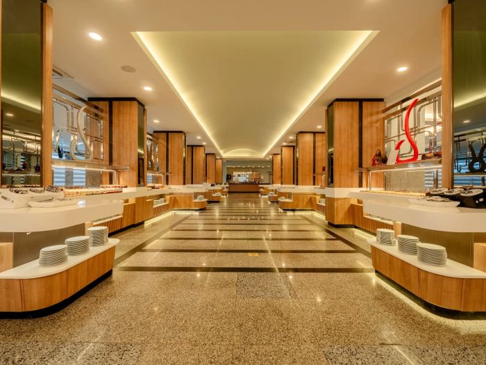 Основен ресторант, а-ла-карт ресторан (платен с предварителна резервация, съгласно концепцията на хотела) 4 бара, дискотека, 2 открити басейна, един от които с водна пързалка и 1 закрит басейн, магазини, СПА център, конферентни зали, паркинг.