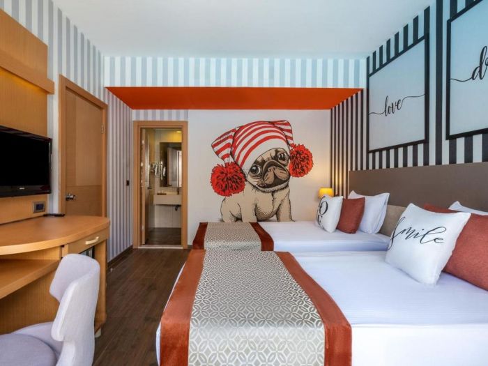 Стаи Main Building: 614 Maing Building Standard Room (изглед градина или море, 27-30 м2), 49 Main Building Family Room (2 спални, баня, изглед градина или море – 38 м2), 16 Main Building Suite Room (спални и всекидневна с изглед градина или море, 50-62 м2).