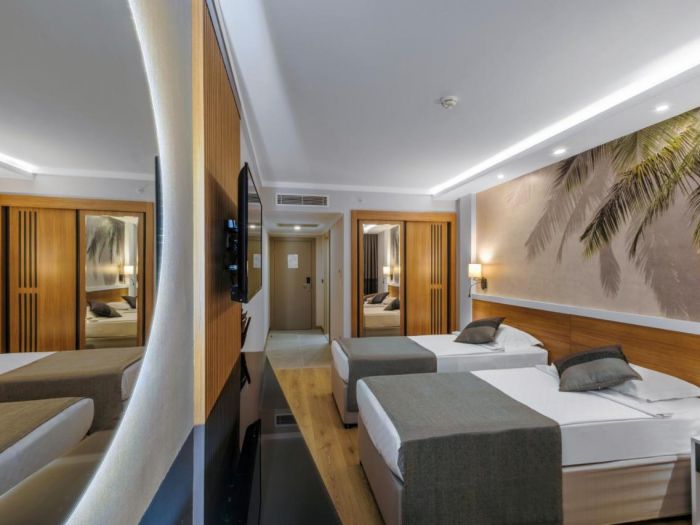 Основен ресторант, 2 а - ла - карт ресторанта, лоби бар, бар на плажа, диско бар, търговски център, доктор, тв салон, закрит басейн, 2 открити басейна, детски басейн, 4 водни пързалки, интернет кафе. За децата: детски басейн, детска площадка, мини-клуб (4-12 год.), тийн клуб (7-13г.), детегледачка (платено). Безплатни услуги: турска баня, сауна, парна баня, джакузи, фитнес аеробика, аквааеробика, плажен волейбол, баскетбол, тенис на маса, дартс, мини-голф, боча, баскетбол, анимационна програма, дискотека, интернет в лоби. Платени услуги: масаж, билярд, игрални автомати, уиндсърфинг (с лиценз), интернет кафе, водни спортове, СПА - център.