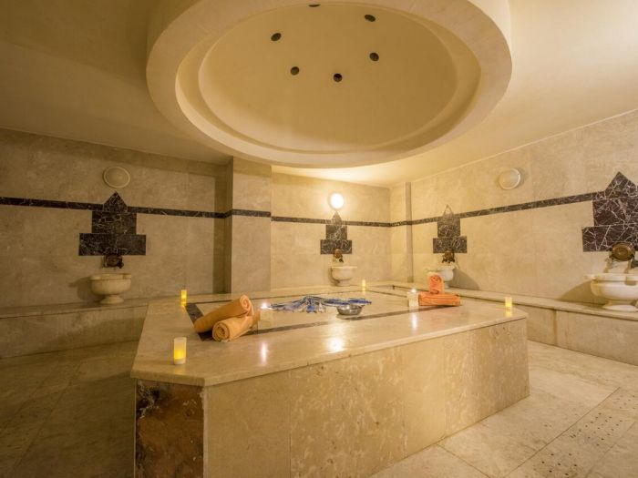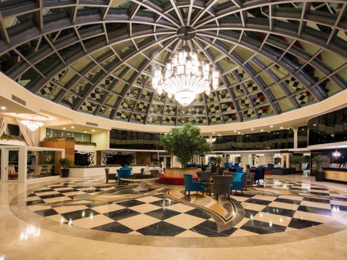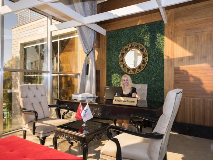 Oсновен ресторант, 2 а-ла-карт ресторанта (турски и рибен -платено), лоби бар,бар на плажа, снек панорамен ресторант, воден бар, дискотека, 2 басейна, вътрешен басейн (работи през зимата), водни пързалки, салон за красота, СПА център, фитнес, сауна, парна баня, релакс стаи, масажи, турска баня, анимация, магазин, конферентни зали. За децата: детски басейн. Безплатни услуги: турска баня, сауна, wifi, фитнес център, тенис на маса, тенис на корт, дарц, боча, игри до басейна и на плажа, плажен волейбол, гимнастика, Платени услуги: джакузи, билярд, масаж, факс, лекар, химическо чистене, коли под наем, джет, парасейлинг, осветление и екипировка за тенис корт.