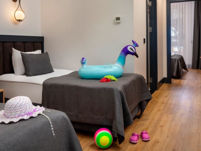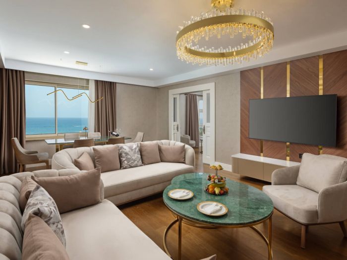 Хотелът разполага с общо 328 стаи, от които 262 стандартни стаи, 64 фамилни стаи и 2 кралски апартамента. Всички стаи са оборудвани с: централен климатик, сателитна телевизия, телефон, безжичен интернет, баня с вана, сешоар, мини бар – зарежда се ежедневно с вода, безалкохолни и бира, сейф, балкон. Почистване на стаите и смяна на кърпите – всеки ден, смяна на бельото – 3 пъти в седмицата.