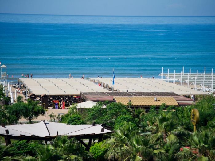 Собствен, пясъчен с дължина на плажната ивица 100 м. Чадъри, шезлонги, матраци и плажни кърпи на плажа и при басейна - безплатно.