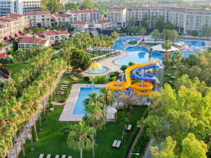 Основен ресторант, 4 а-ла-карт ресторанта - интернационален, турски, далекоизточен, средиземноморски (1 безплатно посещение на 1 от ресторантите при минимум 7 нощувки, с предварителна резервация – с изключение на интернационалния ресторант), станция за бургери и сандвичи, снек бар, сладкарница, 4 бара, диско бар, 2 открити и 1 закрит (отопляем) басейн, аквапарк, амфитеатър, СПА център, магазини, конферентнa залa, паркинг.