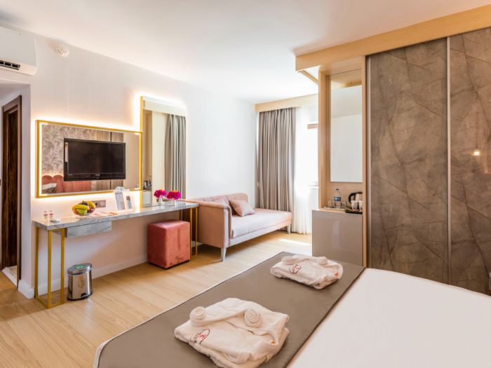 Всички стаи са оборудвани с климатик, телевизор, телефон, баня с душ, сешоар, минибар, сейф, балкон, Wi-Fi. Почистване на стаите и смяна на кърпите - всеки ден, смяна на спално бельо – 3 пъти в седмицата.