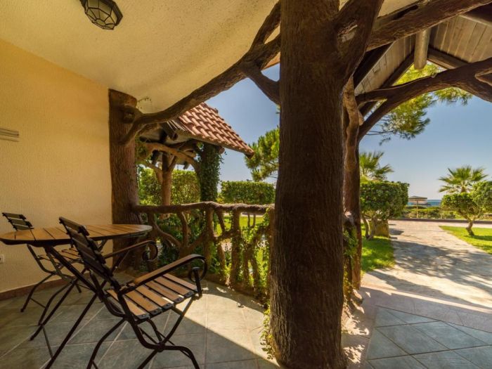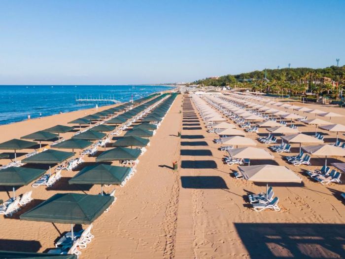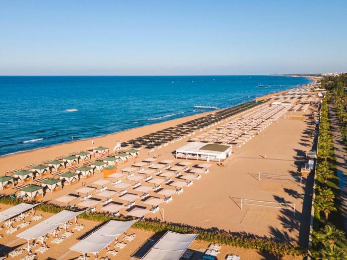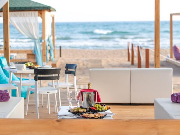 Собствен пясъчен плаж, 2 бара на плажа (единия е винен бар, работи от 03.05 до 31.10) безплатно. На басейна и на плажа: чадъри, шезлонги, матраци – безплатно. Плажни кърпи – безплатно.