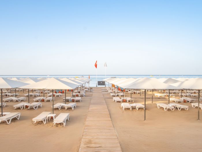 Собствен, пясъчен. Чадъри, шезлонги и плажни кърпи на плажа и при басейна - безплатно.