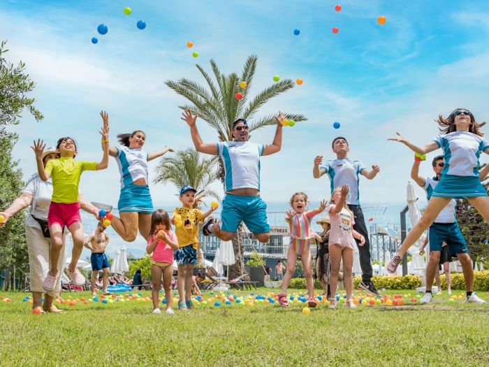 За децата: 2 открити и 1 закрти детски басейн, детска площадка, мини клуб (4-12 г), детска анимация, детска количка (под наем).