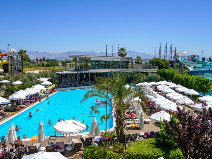 Основен ресторант, 1 а-ла-карт ресторанта (турски или средиземноморски – 1 безплатно посещение при минимум 5 нощувки, с предварителна резервация), 2 снек ресторанта (при басейна и на плажа), сладкарница, 4 бара, 3 открити и 1 закрит (отопляем в определени от хотела периоди) басейн, 3 водни пързалки, СПА център, магазини, 1 конферентна зала.