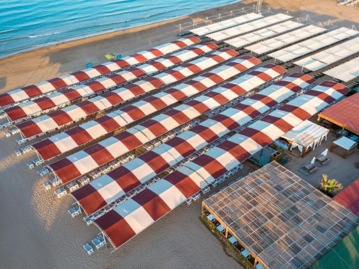 Собствен на 250м. от хотела, пясъчен. Чадъри, шезлонги и матраци на плажа и при басейна - безплатно.