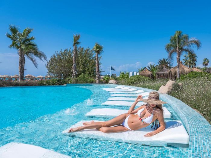Собствен, пясък/чакъл. Чадъри, шезлонги, матраци – на басейните и на плажа - безплатно. Плажни хавлии: безплатно.