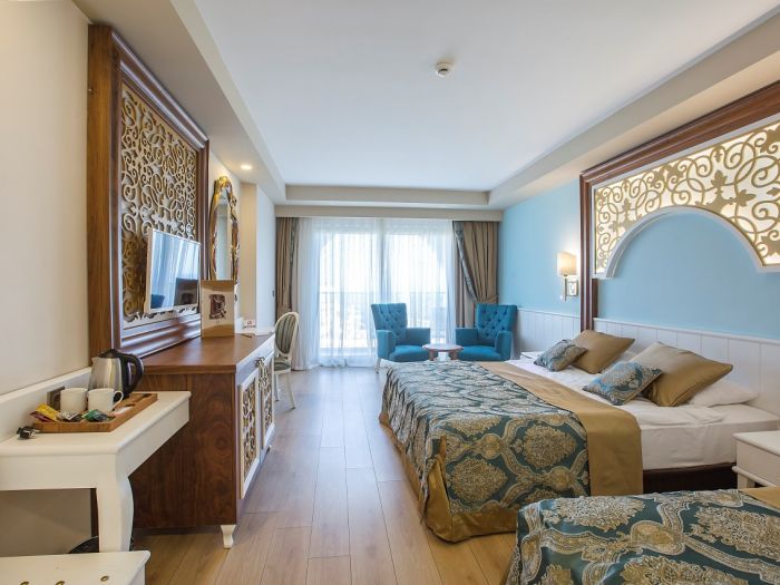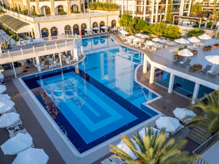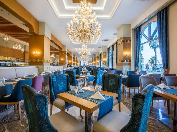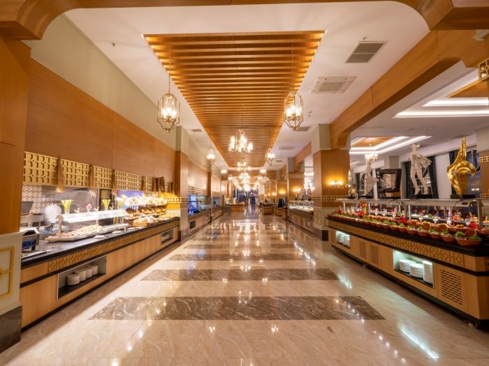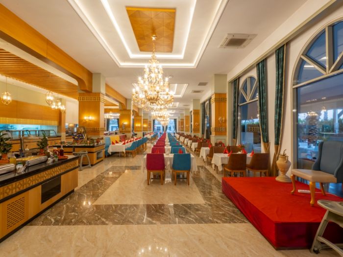 Основен ресторант, 4 а-ла-карт ресторанта (с предварителна резервация - италиански, далекоизточен и османски; мексикански - с доплащане), 7 бара, сладкарница, 2 открити басейна, закрит басейн, водни пързалки, магазини, СПА център, фитнес център, дискотека, паркинг, конферентни зали, WI-FI. За децата: детско меню, детски басейн, водни пързалки, детска площадка, мини клуб (4-7 г.), младежки клуб (8-12 г.), детско кино, мини диско, анимация. Безплатни услуги: сауна, турска баня, парна баня, фитнес, дартс, тенис на маса, плажен волейбол, мини голф, аеробика, водна аеробика, босиа, йога, мини библиотека, анимация, WI-FI. Платени услуги: масаж, фризьор, магазини, игрална зала, компютърни игри, билярд, химическо чистене, лекар, детегледачка, интернет кафе, уроци по сърф, водни спортове.