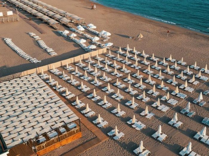Собствен, пясъчно-чакълест на 900м от хотела с осигурен безплатен шатъл на всеки 15 минути. Чадъри, кърпи и шезлонги на плажа и басейна – безплатно.
