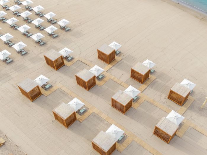Собствен, пясъчно-чакълест. Чадъри, шезлонги и плажни кърпи на плажа и при басейна - безплатно.