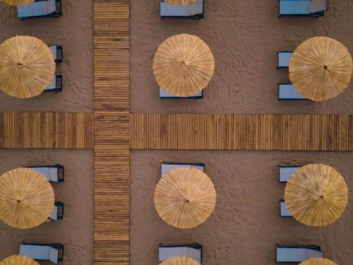 Собствен, пясъчен, на 250 м от основната сграда на хотела. Осигурен е безплатен шатъл транспорт за гостите. Чадъри, шезлонги и плажни кърпи на плажа и при басейна - безплатно.